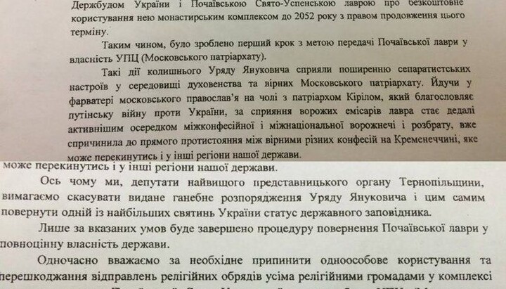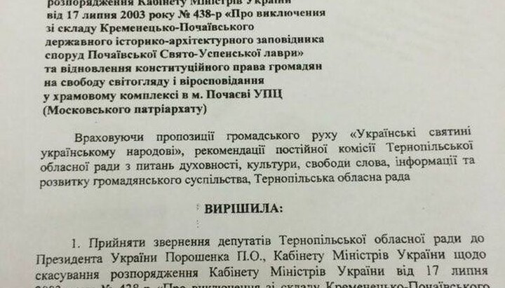 Ternopol Regional Council deputies urge to annul a resolution adopted in 2003 “On Exclusion of Buildings of the Pochaev Lavra of Holy Assumption from Kremenets-Pochaev State Architectural Conservation Zone” and transfer the Lavra premises to state ownership with a view to further enabling representatives of other denominations to have their worship services there.