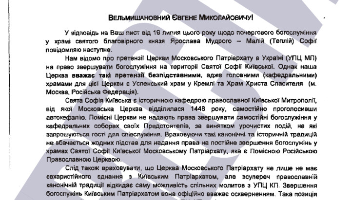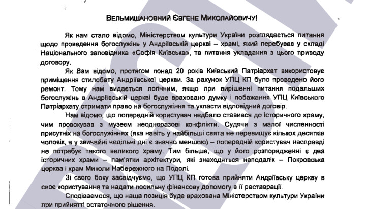 UOC KP’s internal correspondence – letters of Filaret to the MoC – proves that the KP intends to come into ownership of St. Andrew’s church. “Over 20 years the UOC KP has used the stylobate building and born the expenses for repair works. We know the current user has treated the church with negligence, stirring up conflicts with the museum,” Filaret’s letters say.  “It’s consistent then that the UOC KP’s wishes are taken into account and an agreement is concluded.”