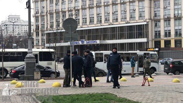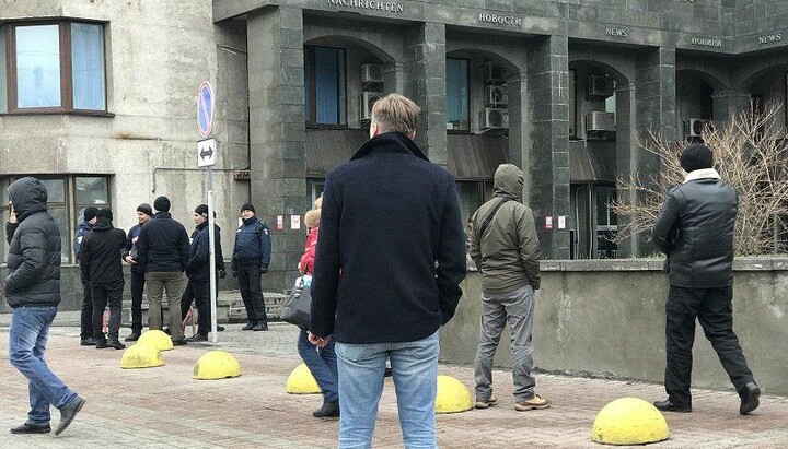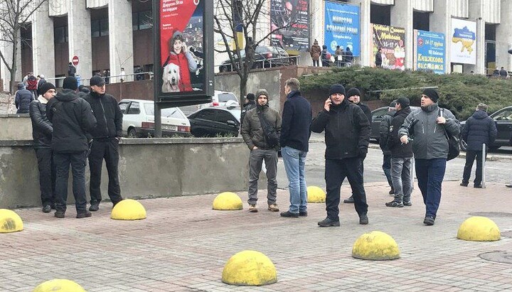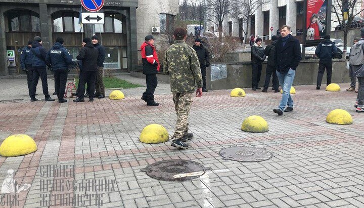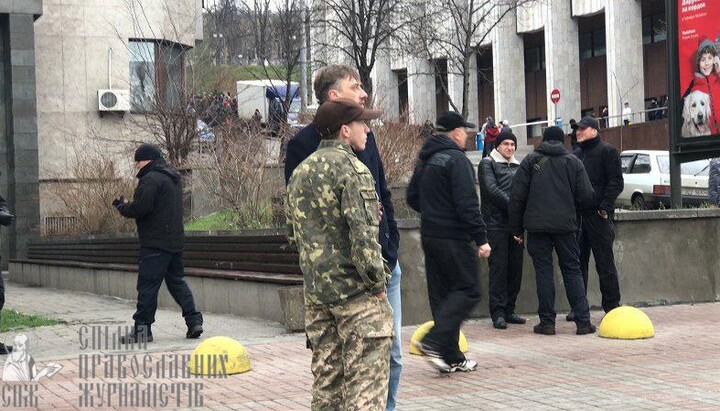 Five young men, who call themselves “Maidan activists”, tried to penetrate into the pess-conference of the UNIAN, dedicated to the results of the Bishops' Council of the Russian Orthodox Church. To prevent possible provocations, the press center did not let them in. The "activists" initially had cardboard cups, filled with a red color.