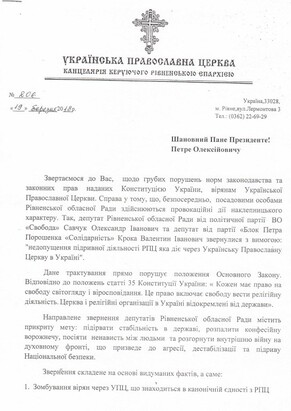 Metropolitan Bartholomew had to write an official letter after two deputies of Rovno Regional Council –Alexander Savchuk from Svoboda party and Valentin Krok from "Block Poroshenko" Solidarity" party – urged the rest of the people's deputies to "prevent subversive activities of the ROC, which operates through the Ukrainian Orthodox Church in Ukraine."