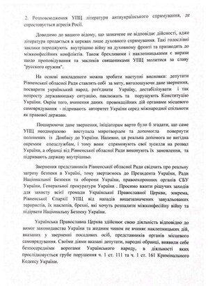 1. To immediately start criminal proceedings and bring to criminal liability the deputies of Rovno Regional Council, who signed the above address, under Article 111 of the Criminal Code of Ukraine (High Treason), art. 161 of the Criminal Code of Ukraine (Inciting religious enmity), Art.295 of the Criminal Code of Ukraine (Appeals to commit acts that threaten public order), art. 364 of the Criminal Code of Ukraine (Abuse of office);