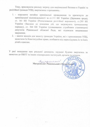 Arising from the foregoing, Metropolitan Bartholomew of Rovno and Ostrog asks the country's top leadership to take decisive actions to protect the entire community of the Ukrainian Orthodox Church, in particular, the Rovno Eparchy of the UOC from "attacks of disguised terrorists".