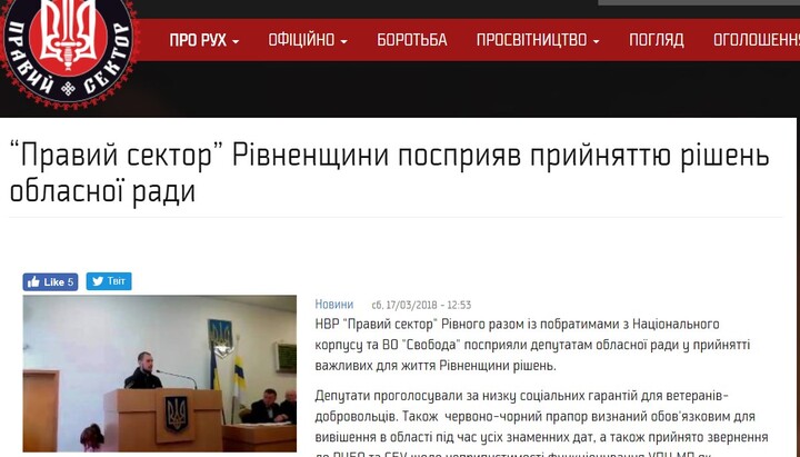 Simultaneously with the decision of Rovno Regional Council , the site of the Right Sector http://spzh.news/en/zashhita-very/28659-appeal-to-the-president-ptycha-case reported that "together with the fellow thinkers from the National Corps and the Svoboda, they helped the deputies of the Regional Council to make important decisions for the life of Rovno".