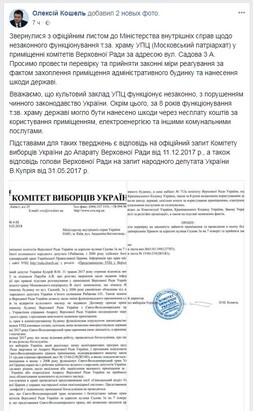 The political expert said he had sent an official letter to the Ministry of Internal Affairs "regarding the illegal functioning of the so-called UOC temple (the Moscow Patriarchate) in the premises of the Committees of the Verkhovna Rada." The public demands law enforcement agencies to respond to "the seizure of the premises of the administrative building and damage caused to the state".