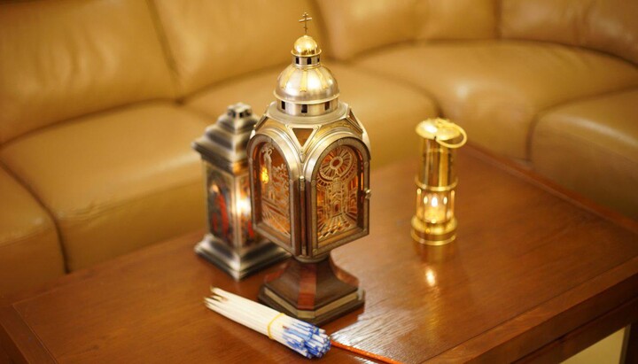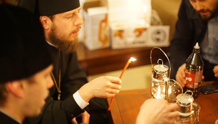 The Holy Fire from Jerusalem to Ukraine was delivered by the official delegation of the Ukrainian Orthodox Church led by the Chancellor of the UOC Metropolitan Anthony of Borispol and Brovary on April 7, at 19 pm. The Fire was given to the clergy of the UOC.
