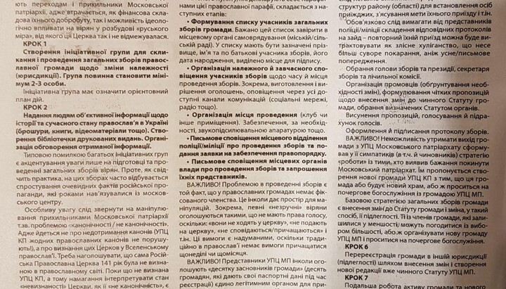 At the end of the special edition, an instruction is published on the "correct agitation" and "legally literate" transition of the UOC communities to the Kyiv Patriarchate. The authors note that it is better not to create new communities in the villages, because then there are problems with the temples. The best option is re-registration.