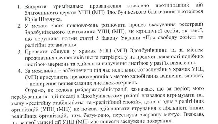 Chairman of the Zdolbunov Regional State Administration Sergei Kondrachuk appealed to the SBU with a demand to conduct searches in the temples of the Ukrainian Orthodox Church.