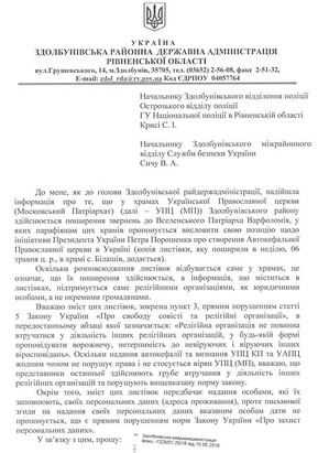 On May 10, Sergei Kondrachuk sent an official appeal to the Security Service of Ukraine (SBU), in which he asked to initiate criminal proceedings against the dean of the Zdolbunov deanery, Protopriest Yury Shevchuk, to conduct a search in the temples of the UOC to find leaflets-appeals and to ensure the presence of law enforcers during Sunday services in the churches of the UOC.