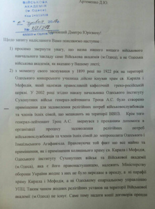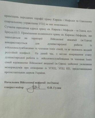 "Considering the fact that all the property, including the premises of the former Ss. Cyril and Methodius Church, the Odessa Institute of the Army and the Military Academy, which is its legal successor, belongs to the Ministry of Defense of Ukraine, none of them was leased either to the community of the Ss. Cyril and Methodius Church or the Odessa eparchial administration of the UOC," the statement said.