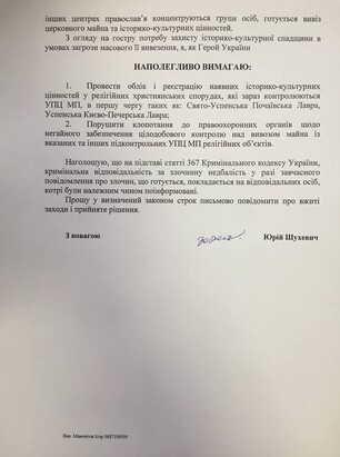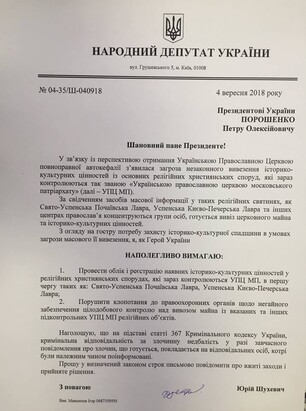 MP from the "Radical Party" faction Yuri Shukhevich was concerned about the property of Orthodox shrines of the UOC. On his Facebook page, Shukhevich published a parliamentary appeal demanding that the authorities should "count and register historical and cultural values" kept in the Pochaev and Kiev-Pechersk Lavras. In the document of September 4, a former nationalist leader of the UNA-UNSO (the Ukrainian National Assembly – Ukrainian People's Self-Defence) refers to media reports that the Lavra is allegedly "preparing to export the church property".