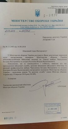 The published document says that Major Bogdan Chereushenko and the soldier Vitaly Kostenko received awards “For commitment and fortitude shown during military service, exemplary performance of military duties and high professionalism”.