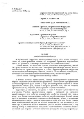On November 13, 2018, the Kiev District Administrative Court was to consider the claim of the NGO “Rule of Law” to the President of Ukraine on establishing the lack of jurisdiction of Petro Poroshenko to interfere in the Church affairs. The meeting was postponed due to illness of the judge.