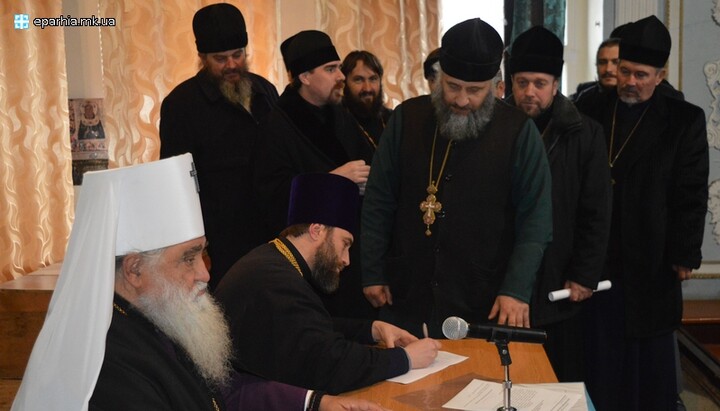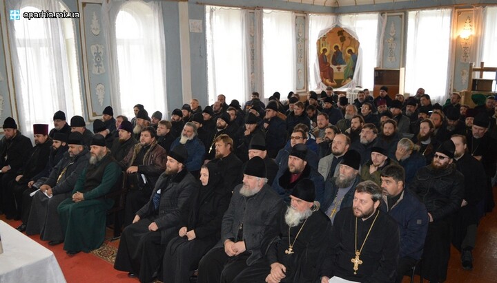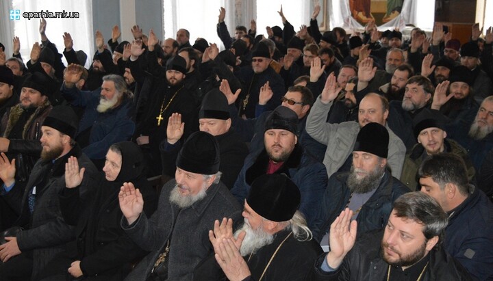 The meeting was preceded by a moleben at the Cathedral of the Nativity of the Blessed Virgin Mary. At the meeting, the clergy unanimously supported the decision of the Bishops’ Council of the Ukrainian Orthodox Church of November 13, 2018, and the activities of His Beatitude Metropolitan Onufry of Kiev and All Ukraine. The attendees signed an appeal to the Primate of the Ukrainian Orthodox Church.