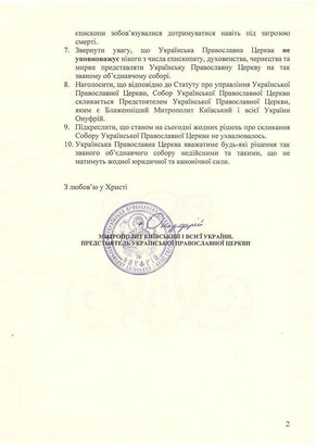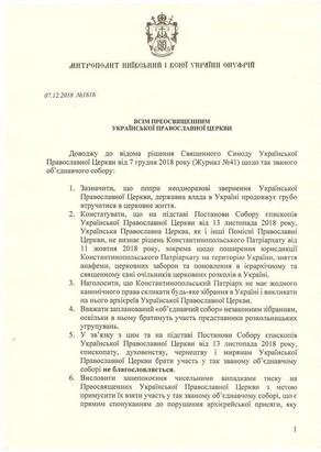 On December 7, 2018, the Primate of the UOC, His Beatitude Onufriy, Metropolitan of Kiev and All Ukraine, informed all the bishops of the decisions of the Holy Synod of the Ukrainian Orthodox Church regarding the “unification council”.