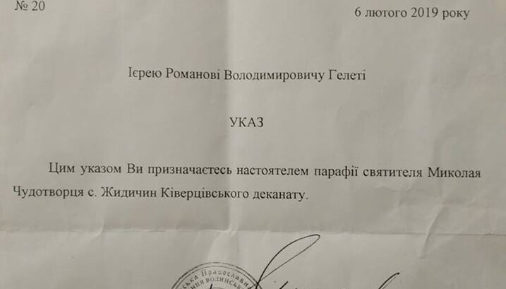 Roman Geleta, the cleric of the UOC temple of St. Nicholas the Wonderworker in vlg. Zhidychin of Kivertsy district near Lutsk, whose father, Protopriest Vladimir Geleta, is a rector of this temple, received an ordinance from the UOC KP "metropolitan" Mikhail Zinkevich that he was appointed as a new rector. The document is printed on the UOC KP form and stamped with the UOC KP. Not a single word is said about the OCU. The UOC cleric posted the “decree” on his Facebook page.