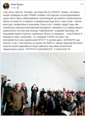 On February 27, 2019, after the meeting of the territorial community in the village of Kruty, Nezhin district, Chernigov region, Oleg Buzun, the chairman of the district council, allowed himself to speak insultingly on the Facebook social network about his voters who, due to religious beliefs, refused to succumb to provocations and change the canonical subordination of the local religious community, according to the press service of Nezhin eparchy.