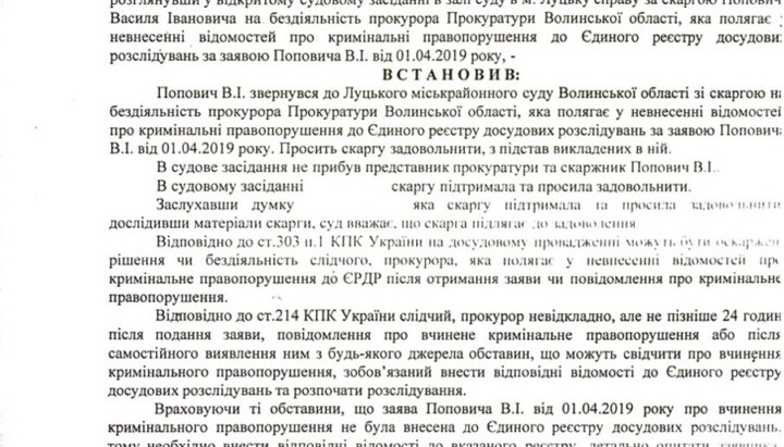 The court found illegal the inaction of the Prosecutor of the Volyn region, who did not enter to the URPTI the information about the violation of the rights of the religious communities of the UOC and granted the claim of Archpriest Vasily Popovich.