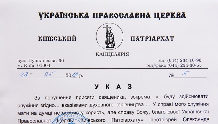 "For violation of the oath of the priest, in particular," ... I will serve in accordance with ... the instructions of the spiritual leadership ... In the matter of my ministry, to pursue not personal benefit, but the work of God for the benefit of his Ukrainian Orthodox Church of the Kiev Patriarchate”, Archpriest Alexander Trofimliuk is banned in the priesthood,” the text of the document says.