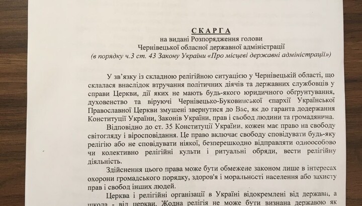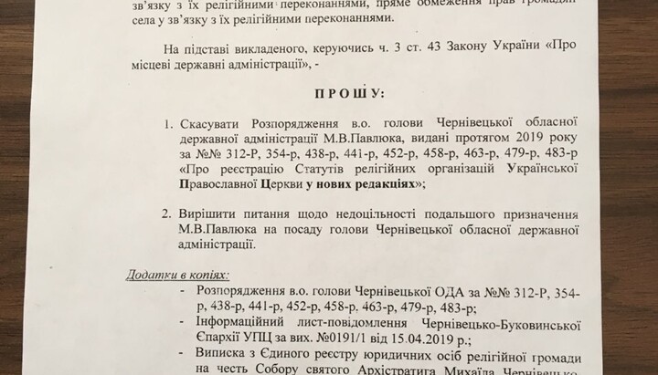 In this regard, the Metropolitan asks the President to cancel the decisions of the head of Chernovtsy Regional State Administration "On registration of statutes of religious organizations of the Ukrainian Orthodox Church in new editions" and also to consider the inexpediency of M. Pavliuk’s further holding the post of head of Chernovtsy Regional State Administration.