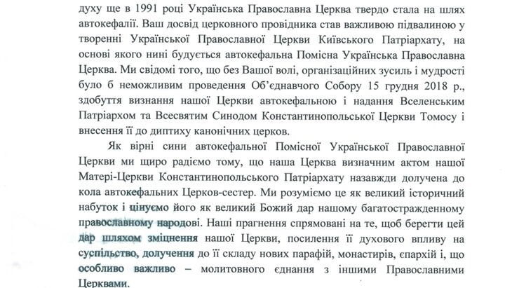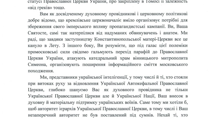 “We ask you, Your Holiness, for the sake of ensuring the unity of the Ukrainian Orthodox Church, preserving its authority within Ukraine and in the Orthodox world, to delegate the discussion of all critical issues to the representative church bodies defined thereto by the Statute of the Church. We draw your attention to the fact that the overwhelming majority of controversies, announced in the media as signs of a split (including the issue of obtaining the patriarchal status of our church, the formation of the composition of the Synod, and relations with the Constantinople and other Churches), are working questions. Their consistent decision is possible in a friendly discussion and dialogue. Public highlight and sensation-avid journalists cannot give any good fruit. It is for the sake of the good of the church and Ukraine that we ask you, Your Holiness, to refrain in the near future from any public deliberations or interviews that may bring about anxiety and uncertainty among the Orthodox people and please the enemies of Ukraine. We believe that your prayer and your wisdom of the spiritual guide will be an edifying directive to all of us for many years ahead,” the letter emphasizes.