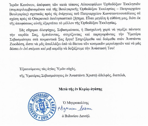 Metropolitan Daniel of Vidin wrote a letter to the hierarchs of the Church of Greece, in which he analyzed and severely criticized the actions of Patriarch Bartholomew.