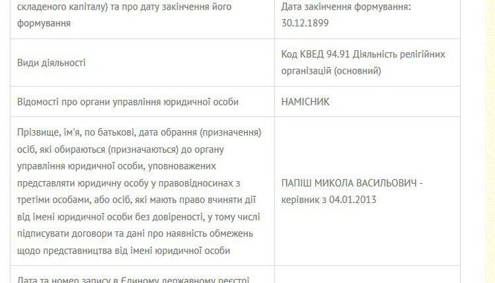 More interesting are the data entered for the St. Theodosius Stavropegy Monastery, which is registered under No 24074121. According to the Register, Nikolai Papish remains its rector, and the end date for the formation of the statutory capital is 30.12.1899. What and how was changed in the data of the monastery of the Kiev Patriarchate remains incomprehensible.