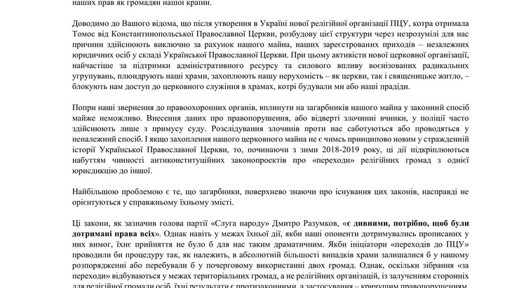 “We bring to your attention that after the formation in Ukraine of a new religious organization, Orthodox Church of Ukraine, which received the Tomos from the Constantinople Orthodox Church, the development of this structure is carried out for reasons unknown to us solely at the expense of our property, our registered parishes – independent legal entities within the Ukrainian Orthodox Church Churches,” the authors of the appeal said. “At the same time, activists of the new church organization, most often with the support of the administrative resource and the military influence of paramilitary radical groups, ruin and desecrate our temples, seize our real estate – both churches and priestly housing, block our access to church service in the temples built by us or our great-grandfathers."