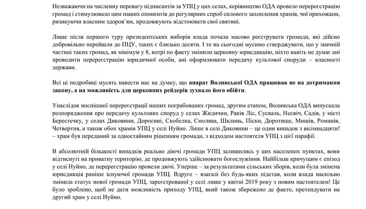 "There is every reason to affirm that the vast majority of re-registrations of our communities ‘in accordance with the law on religious organizations’ actually violates all its norms, not to mention the constitutional rights of our believers," the document emphasized and cited a number of facts that prove the former’s involvement of the leadership of the Volyn Regional State Administration and personally its head Alexander Savchenko, as well as acting chairman of the Volyn Regional State Administration Alexander Kirichuk, in the illegal seizures.