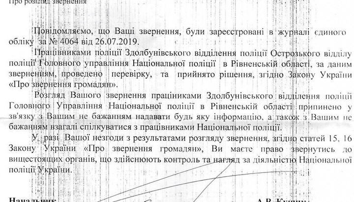 The UOJ correspondent asked the head of the Zdolbunov Police Department A.V. Kushak for clarification regarding a letter addressed to Natalya Gnatishina, however, the response to the appeal was the refusal to give any comments.