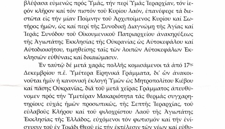 In his letter the Primate of the Church of Greece said that in December 2018, he received “with joy” the letters about the “canonical election” of Epiphany. In response, he sent congratulations to the head of the OCU on behalf of his entire Church.