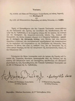 A copy of the joint communique of Patriarch Theodore II of Alexandria and the Primate of the Polish Orthodox Church, His Beatitude Metropolitan Savva in support of the canonical Ukrainian Orthodox Church, was published by the Greek outlet “Katanixi”.