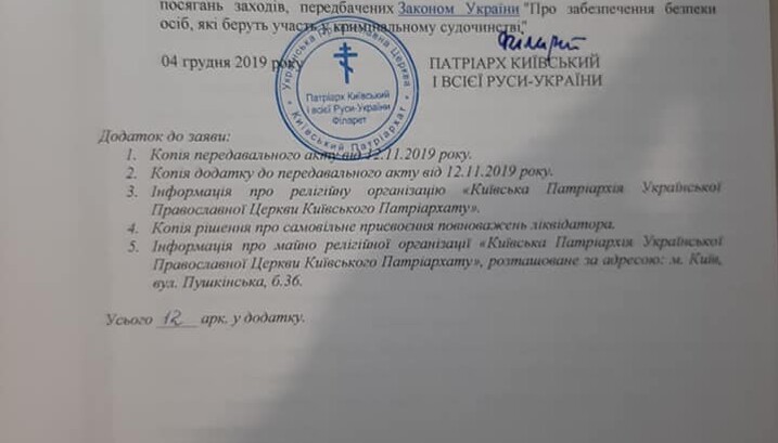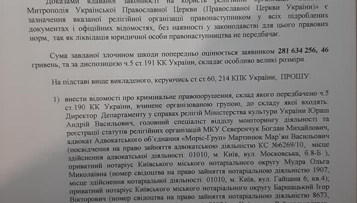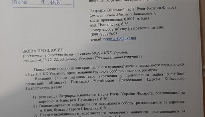 “I report on the commission of a criminal offence, the body of which is provided for in Part 5 of Art. 191 of the Criminal Code of Ukraine, organized by a group on a particularly large scale. The specified crime consists in the appropriation of property of the religious organization ‘Kiev Patriarchy of the Ukrainian Orthodox Church of the Kiev Patriarchate’,” the statement said.
