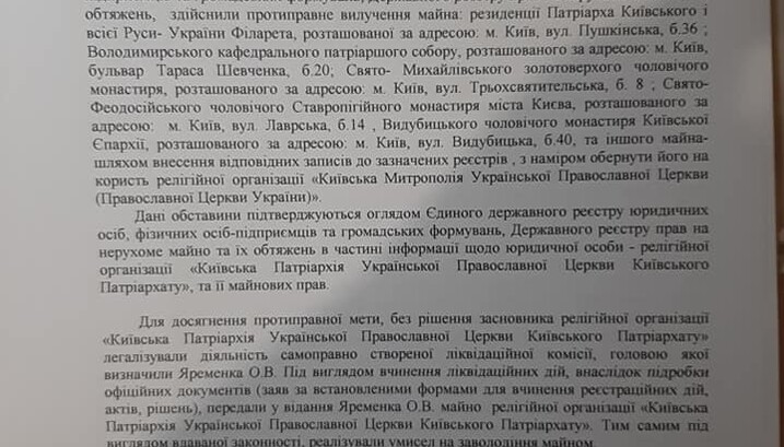 “Thus, under the guise of alleged legitimacy, they fulfilled the intent to seize property. The crime is considered to be completed from November 12, 2018, from the moment of transfer of the property, appropriated by Mr. Yaremenko, to the religious organization ‘Kiev Metropolis of the Ukrainian Orthodox Church (Orthodox Church of Ukraine) and actually its head – Sergei (Epiphany) Dumenko," the document reads.