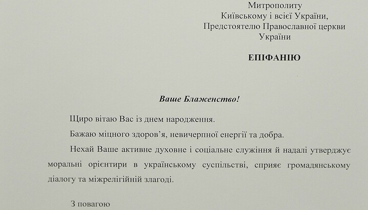 The "Primate" of the OCU Epiphany Dumenko received a congratulatory address on the occasion of his birthday from the President of Ukraine Vladimir Zelensky, a photocopy of which was published on the website of the new church structure.