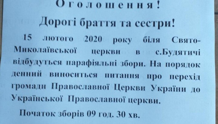 On February 13, 2020, an organized group of OCU raiders gathered near the St. Nicholas Church of the UOC in the village of Budiatychi of the Ivanychy district, Volyn region, demanding that the doors should be opened and representatives of the new religious structure should be allowed into the church, report eyewitnesses of the events present in the place.