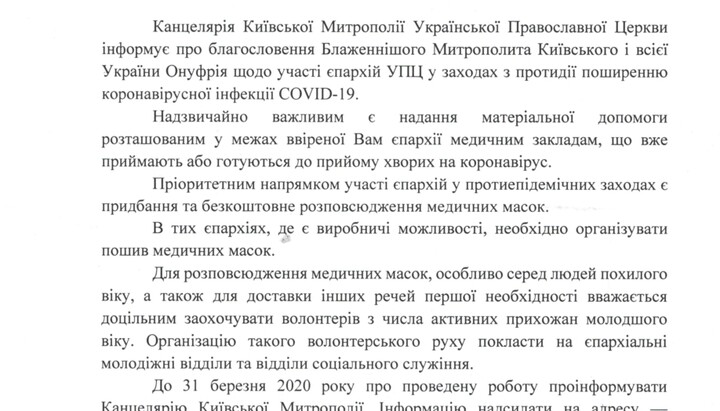 On March 23, 2020, the Primate of the UOC, His Beatitude Metropolitan Onuphry of Kiev and All Ukraine signed a circular in which he blessed all dioceses to take part in activities to combat the spread of coronavirus. This was announced by the UOC Information and Education Department.
