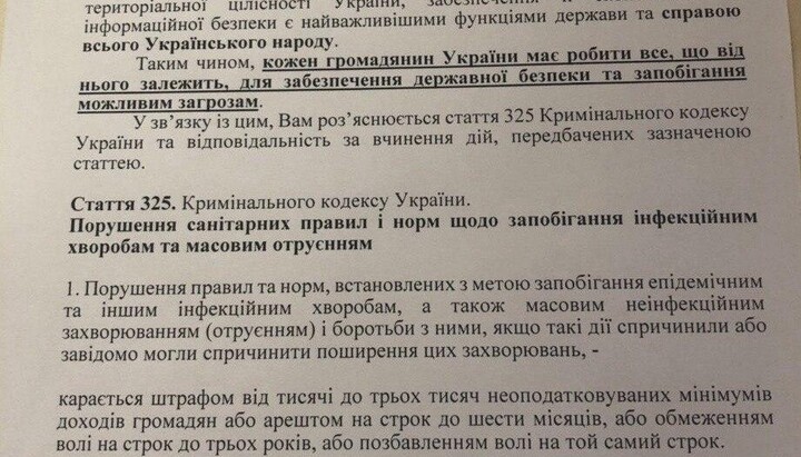“The uncontrolled spread of this disease can pose a significant threat to the state security of Ukraine. <...> According to Article 17 of the Constitution of Ukraine, to protect the sovereignty and territorial indivisibility of Ukraine, and to ensure its economic and informational security are the most important functions of the State and a matter of concern for all the Ukrainian people. Thus, every citizen of Ukraine should do everything in his/her power to ensure state security and prevent possible threats. In this regard, article 325 of the Criminal Code of Ukraine and responsibility for committing the actions provided for by this article are explained to you,” the text says.