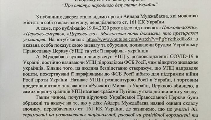 MPs request to open case against Muzhdabaev for discrimination against UOC