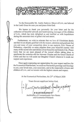 The Director of the Lviv City Council’s Mayor Administration Department published a letter from Patriarch Bartholomew.