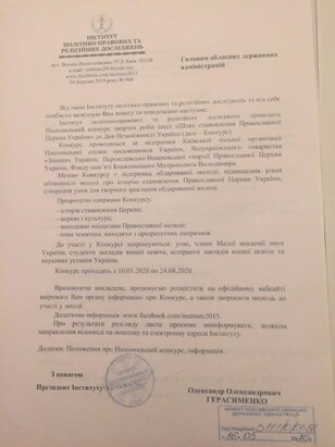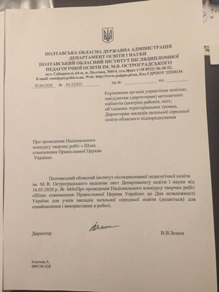 "Another example of this is the activity of the Department of Education and Science of the Poltava Regional State Administration, which is actively promoting the project of the public organization ‘Institute of Political, Legal and Religious Studies’ to hold a competition of creative works ‘The path of formation of the Orthodox Church of Ukraine’ on the Independence Day of Ukraine," the hierarch explained. “With the support of the administrative resource, in particular, heads of educational administrative bodies, heads of methodological offices of districts, cities, united territorial communities, and directors of general secondary education institutions of regional subordination are involved to ensure the implementation of this event.”