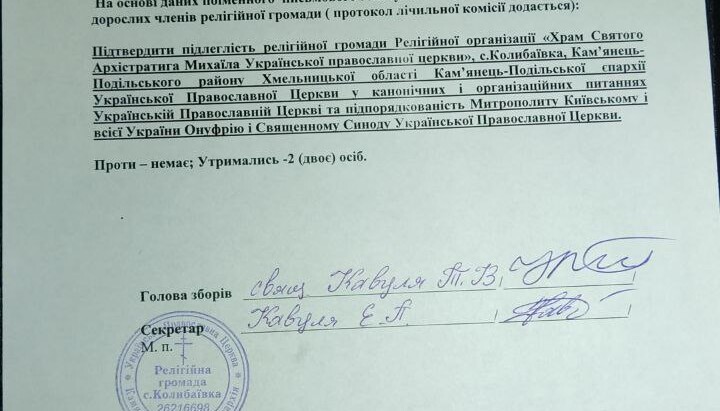 The authorities of the Khmelnytsky region illegally re-registered the religious community of the Ukrainian Orthodox Church in the village of Kolybayivka, Kamyanets-Podilsky district, in favor of the OCU. Archpriest Tarasy Kavulya, rector of the Archangel Michael Church, told the UOJ about this.