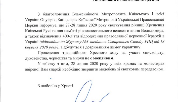 A circular of the Kyiv Metropolis on the celebration of the anniversary of the Christianization of Rus’ under quarantine in 2020 has been released.