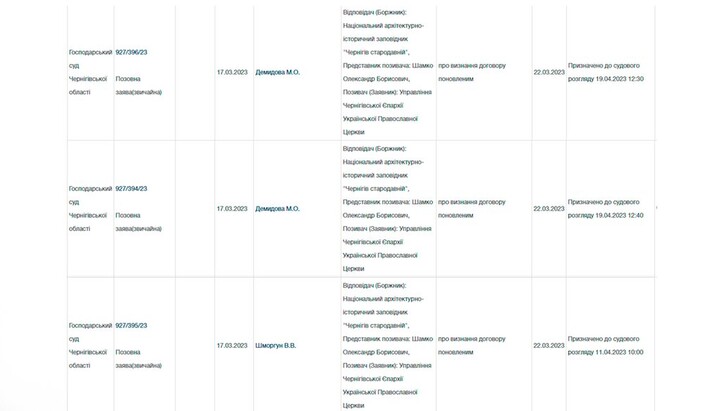 The Uniform Register of Court Decisions has registered three statements of claim from the Chernihiv Eparchy of the UOC, in which the Church requests the court to recognize the agreements for the lease of premises with "Chernihiv Ancient" as renewed.