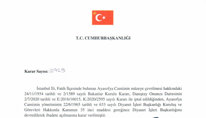 The decree also says: "Decided: to transfer the administration of Aya Sofya to the Diyanet (the Directorate for Religious Affairs of Turkey – Ed.) and open it for divine services".