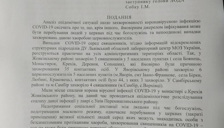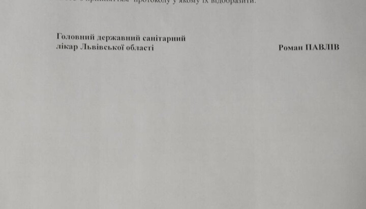 On July 31, 2020, the director of the Lviv Laboratory Centre of Ukraine’s Ministry of Health Roman Pavlov prepared the Submission to Ivan Sobko, head of emergency response, deputy head of the LRSA, regarding the spread of COVID-19, in which he stated the need to stop performing services in the temples of the region. This was reported by the Internet resource "Vysokyi Zamok".