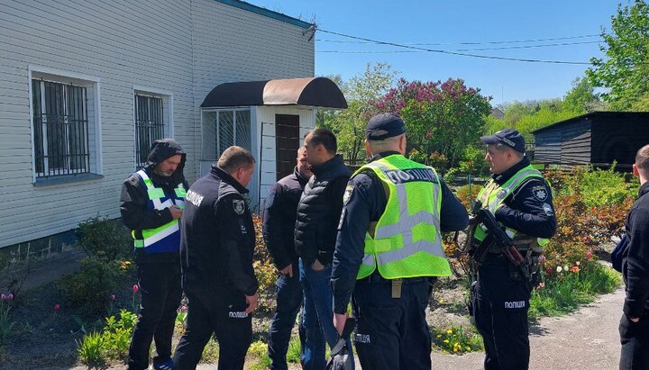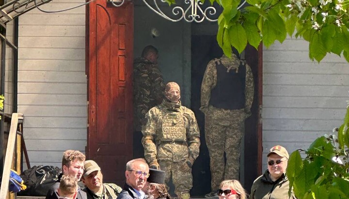 One of the direct participants in the seizure of the temple is the chairman of the Boyarka City Council Oleksandr Zarubin. The head of the Fastiv police department is also present at the scene.
