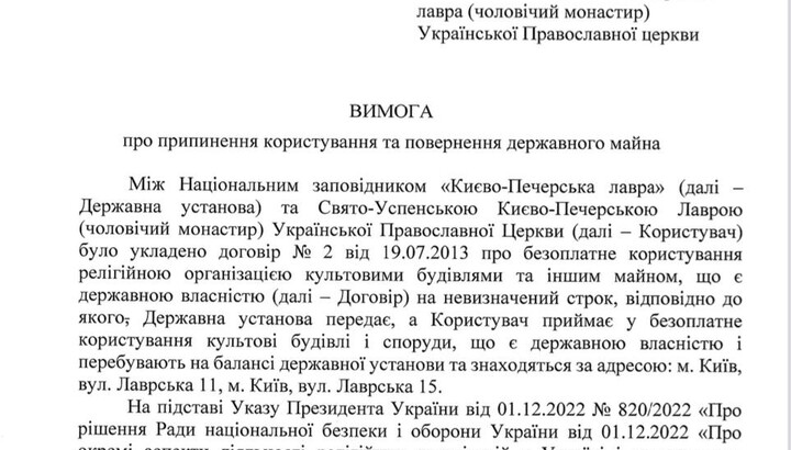 The head of the Ministry of Culture said that the UOC should vacate the Kyiv-Pechersk Lavra within three days and "return its property to the Reserve".