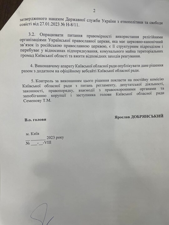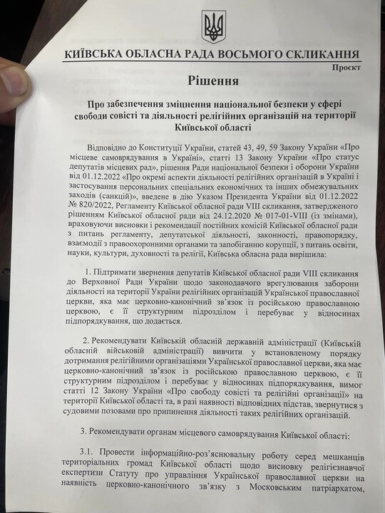 On June 9, 2023, the Kyiv Regional Council adopted a decision “On Ensuring the Strengthening of National Security in the Sphere of Freedom of Conscience and the Activities of Religious Organizations on the Territory of the Kyiv Region,” Eurosolidarity deputy Roman Tytykalo posted on Facebook.