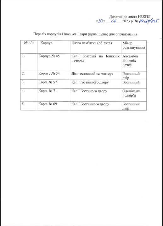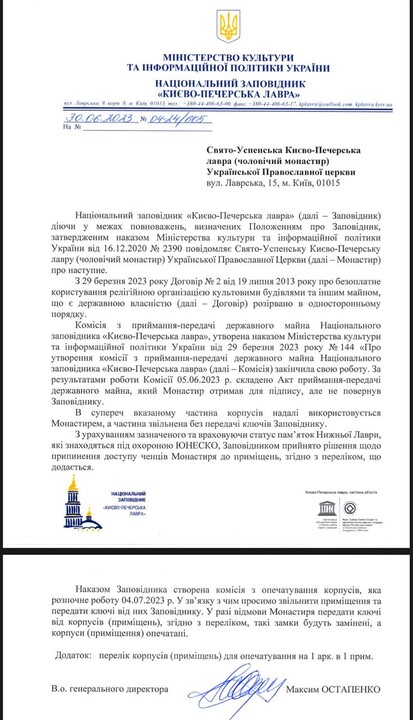 "The reserve (Kyiv-Pechersk Lavra – Ed.) made a decision to terminate the access of the monks of the monastery to the premises... By order of the reserve, a commission was set up to seal the buildings, which will begin work on July 4, 2023. In this regard, we ask you to vacate the premises and hand over the keys to the reserve," says the document sent to the address of the Kyiv-Pechersk Lavra.