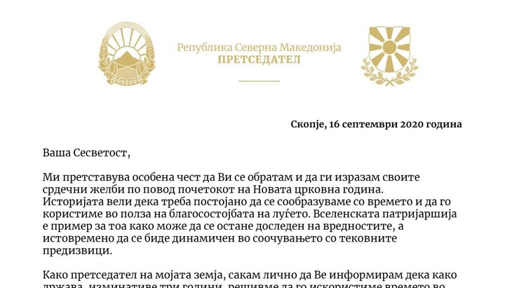 Congratulating the head of the Phanar with the ecclesiastic New Year, the President of North Macedonia, on behalf of the citizens of the country, asked him to continue the earlier process and use the appeal right of the Ecumenical Patriarchate to recognize the autocephaly of the schismatic Macedonian "church".